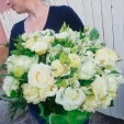 Стандартный (на фото): роза белая - 3 шт., альстромерия белая - 5 шт., эустома белая - 5 шт., салал, сетка зеленая. Примерный объем букета 30см.