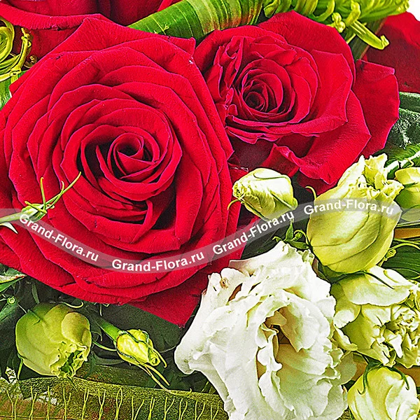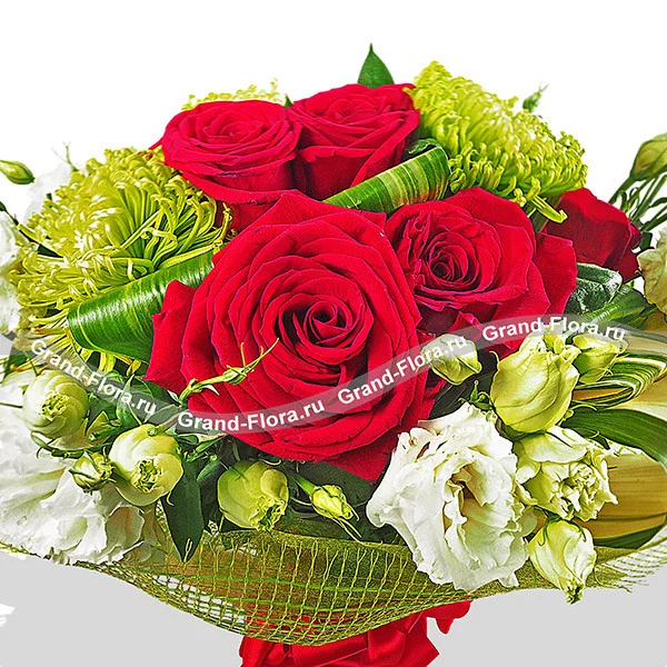 ДЕЛЮКС: роза красная -  19 шт, хризантема одноголовая зеленая - 12 шт, эустома белая - 10 шт, лист аспидистры загнутый - 8 шт, сетка зеленая. Примерный размер: 45Х45 см.