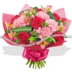 Роза красная - 15 шт, гвоздика розовая - 18 шт, альстромерия розовая - 14 шт, лист аспидистры загнутый - 9 шт, фетр красный.