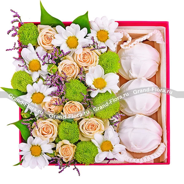 Уменьшенный: хризантема кустовая зеленая - 1шт., роза кустовая кремовая - 3 шт., хризантема кустовая белая - 2 шт., лимониум(статица) - 1шт., декоративная зелень, зефир, оазис, коробка.