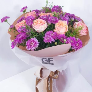 Люкс: роза розовая - 15 шт., хризантема белая кустовая - 5 шт., альстромерия розовая - 3 шт., ирисы - 24 шт., декоративная зелень, лента.