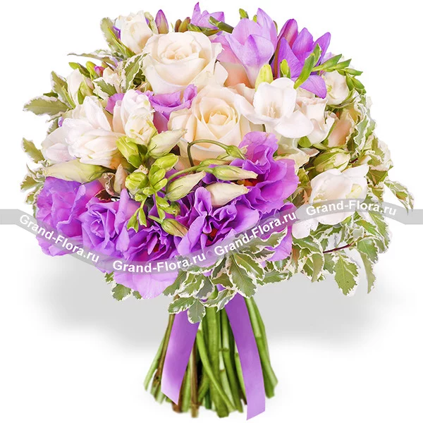 Стандарный: роза белая - 3 шт., эустома фиолетовая - 2 шт., фрезия белая - 2 шт., фрезия фиолетовая - 2 шт., декоративная зелень., упаковка, лента.