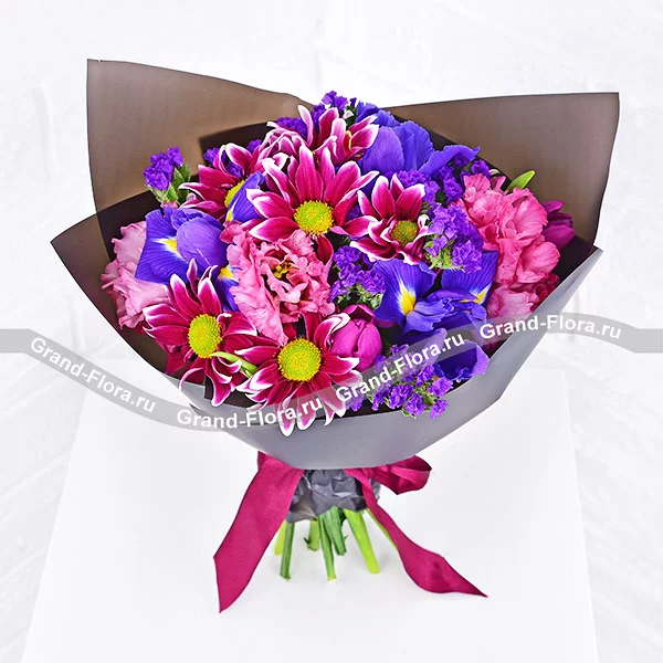 Люкс: ирисы - 8 шт., хризантема кустовая фиолетовая - 3 шт., эустома розовая - 9 шт., тюльпан фиолетовый - 7 шт., статица, упаковка, лента. Примерный размер: 45Х45 см.