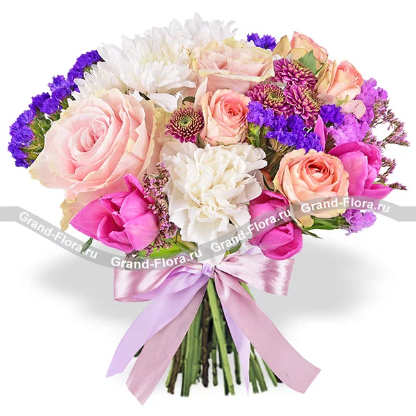 роза розовая - 6 шт., роза кустовая розовая - 3 шт., хризантема кустовая белая - 2 шт., гвоздика белая - 3 шт., тюльпан розовый - 7 шт. (замена на розы и альстромерии), хризантема кустовая фиолетовая - 2 шт., статица, лимониум, лента. Примерный размер: 40Х40 см.
