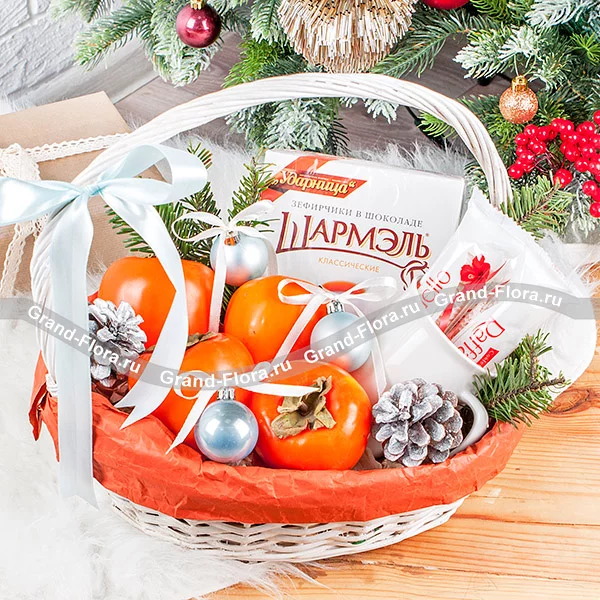 Уменьшенный: хурма - 0,5 кг., зефир "Шармэль" - 75 гр., кружка* - 1 шт., конфеты "Raffaello" 40 гр - 1 шт., шишки - 1 шт., шарики - 1 шт., декор., ель, корзина малая.