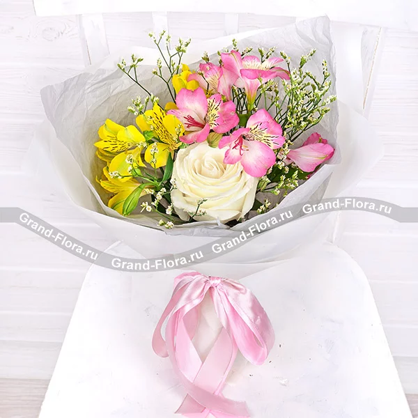 Роза белая – 1 шт., роза розовая – 2 шт., альстромерия желтая – 1 шт., альстромерия розовая 1 шт., лимониум белый– 1 шт., упаковка, лента.