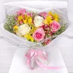 Роза белая – 2 шт., роза розовая – 2 шт., альстромерия желтая – 2 шт., альстромерия розовая –3 шт., лимониум белый– 2 шт., упаковка, лента.