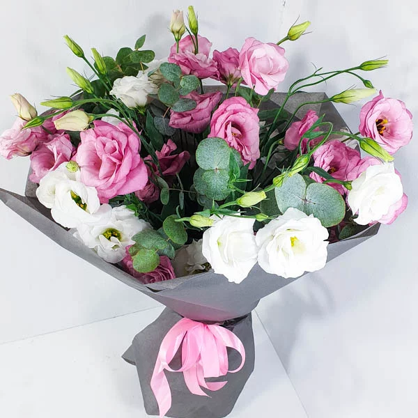 ДеЛюкс: эустома розовая - 20 шт., эустома белая - 21 шт., декоративная зелень, упаковка крафт, лента розовая.
